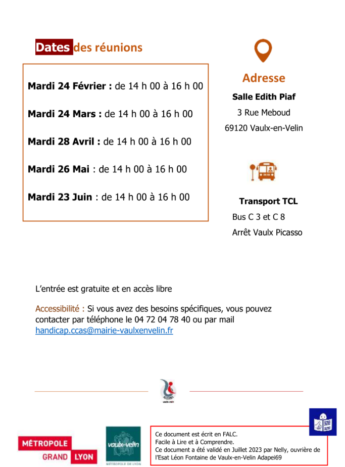 Vous trouverez ci-dessous une communication transmise par Mme Fabienne MATHEVON, chargée de la Mission Handicap et Accessibilité à la Ville de Vaulx-en-Velin 🏛️♿.