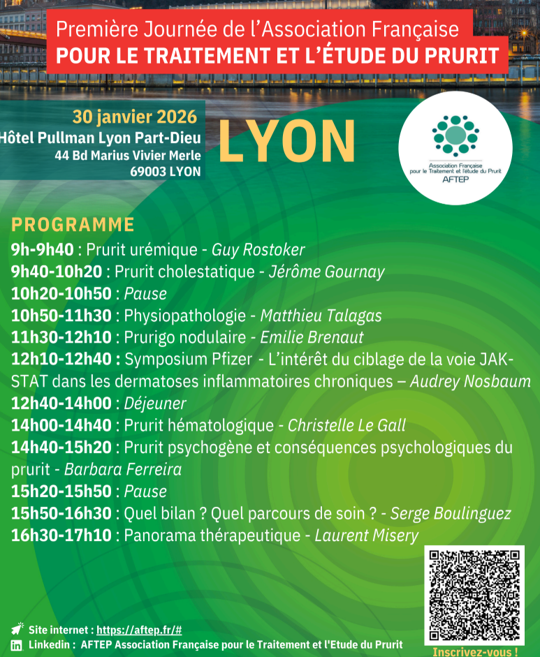 "Bonjour. Je vous adresse le programme de la première journée de l’association française pour le traitement et l’étude du prurit (AFTEP). Une journée entière dédiée au prurit avec des orateurs de qualité !